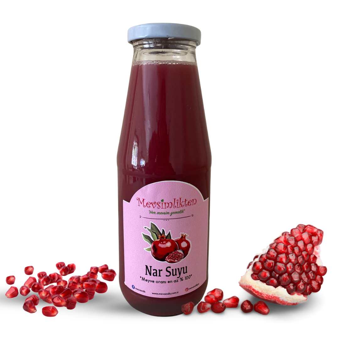 Mevsimlik nar suyumuz 730 ml doğal ve ev yapımıdır. Mevsiminde toplanan narlarla yaptığımız nar suyumuzda hiçbir koruyucu, katkı maddesi veya gıda boyası yoktur. İçerisinde şeker bulunmamaktadır. Bolca nar kullanılarak hazırladığımız nar suyumuzu keyifle tüketmenizi tavsiye ederiz.